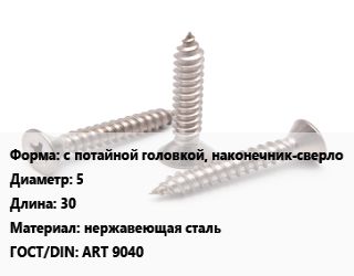 Саморез с потайной головкой, наконечник-сверло D=5 L=30 нержавеющая сталь ГОСТ: ART 9040, кг, для дерева цена от 25 963 ₽ / кг, где купить, условия доставки в Луганске и Луганской области
