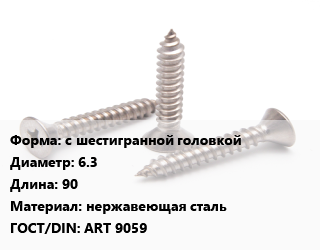 Саморез с шестигранной головкой D=6.3 L=90 нержавеющая сталь ГОСТ: ART 9059, шт цена от 6.98 ₽ / кг, где купить, условия доставки в Луганске и Луганской области