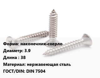 Саморез наконечник-сверло D=3.9 L=38 нержавеющая сталь ГОСТ: DIN 7504