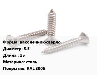 Саморез наконечник-сверло D=5.5 L=25 сталь RAL 3005, упаковка 420 шт цена от 1 233 ₽ / кг, где купить, условия доставки в Луганске и Луганской области
