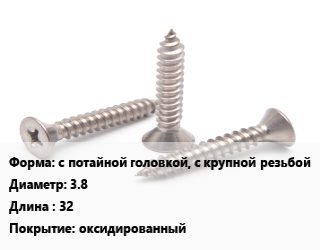 Саморез с потайной головкой, с крупной резьбой D=3.8 L=32 оксидированный, упаковка 100 шт цена от 85.5 ₽ / кг, где купить, условия доставки в Луганске и Луганской области