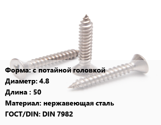 Саморез с потайной головкой D=4.8 L=50 нержавеющая сталь ГОСТ: DIN 7982, кг, по запросу цена от 1 301 ₽ / кг, где купить, условия доставки в Луганске и Луганской области