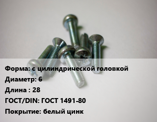 Винт с цилиндрической головкой 6х28 ГОСТ 1491-80 белый цинк