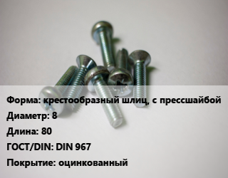 Винт крестообразный шлиц, с прессшайбой 8х80 DIN 967 оцинкованный