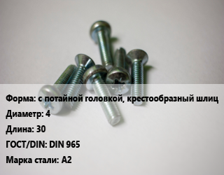 Винт с потайной головкой, крестообразный шлиц 4х30 DIN 965 Сталь: А2, цена за шт, кг цена По запросу где купить, условия доставки в Луганске и Луганской области
