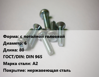 Винт с потайной головкой 6х80 DIN 965 Сталь: А2 нержавеющая сталь, цена за шт, кг цена от 47.7 ₽ / кг, где купить, условия доставки в Луганске и Луганской области