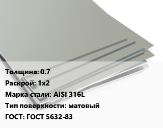 Лист нержавеющий 0.7 1х2 Сталь: AISI 316L Тип:матовый ГОСТ 5632-83, х/к цена от 339 145 ₽ / т, где купить, условия доставки в Луганске и Луганской области