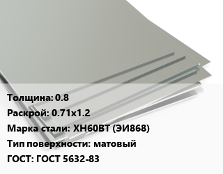 Лист нержавеющий 0.8 0.71х1.2 Сталь: ХН60ВТ (ЭИ868) Тип:матовый ГОСТ 5632-83
