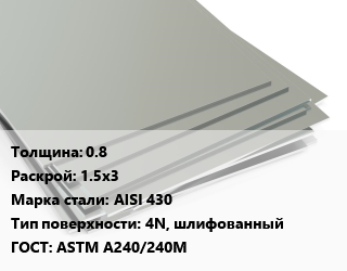 Лист нержавеющий 0.8 1.5х3 Сталь: AISI 430 Тип:4N, шлифованный ASTM А240/240М